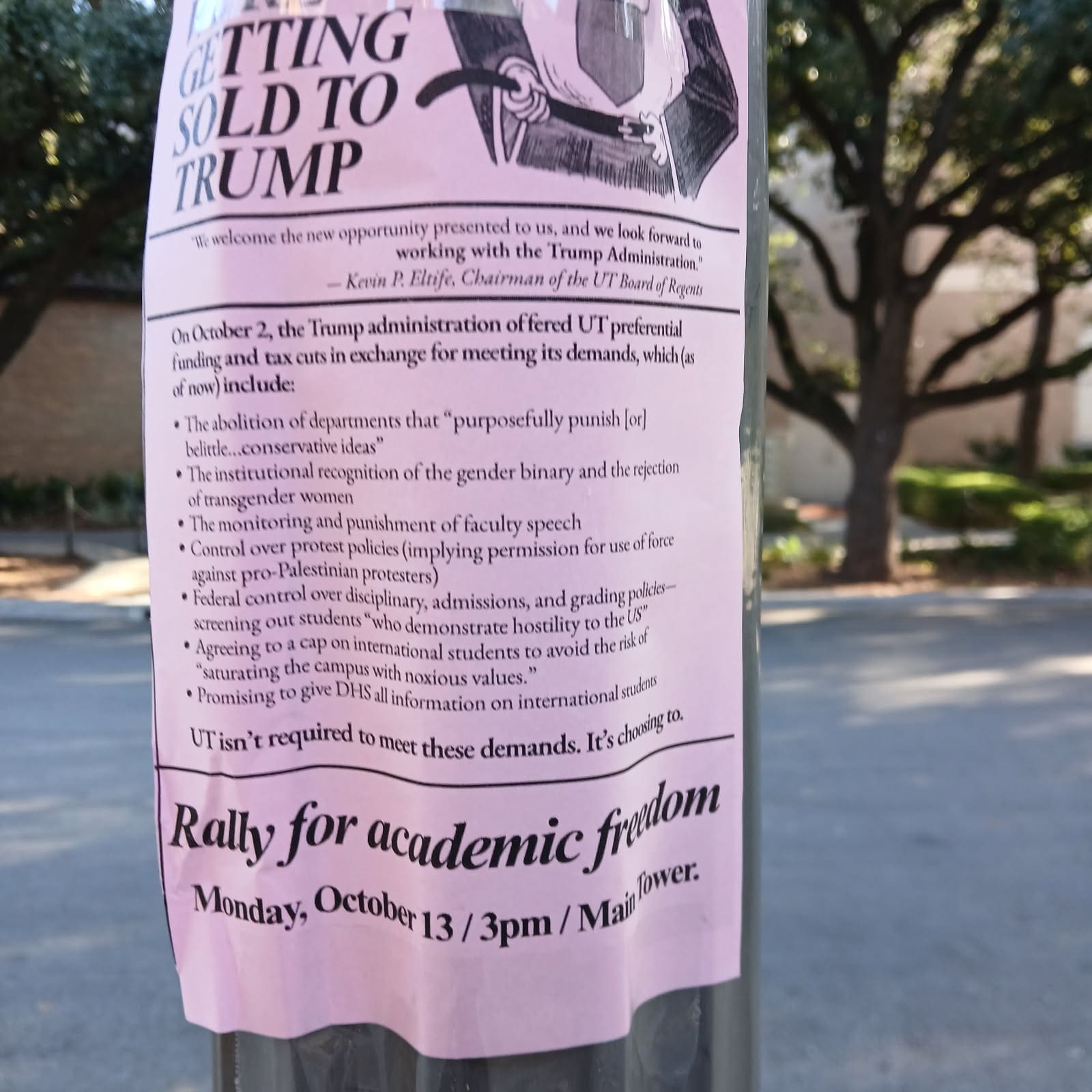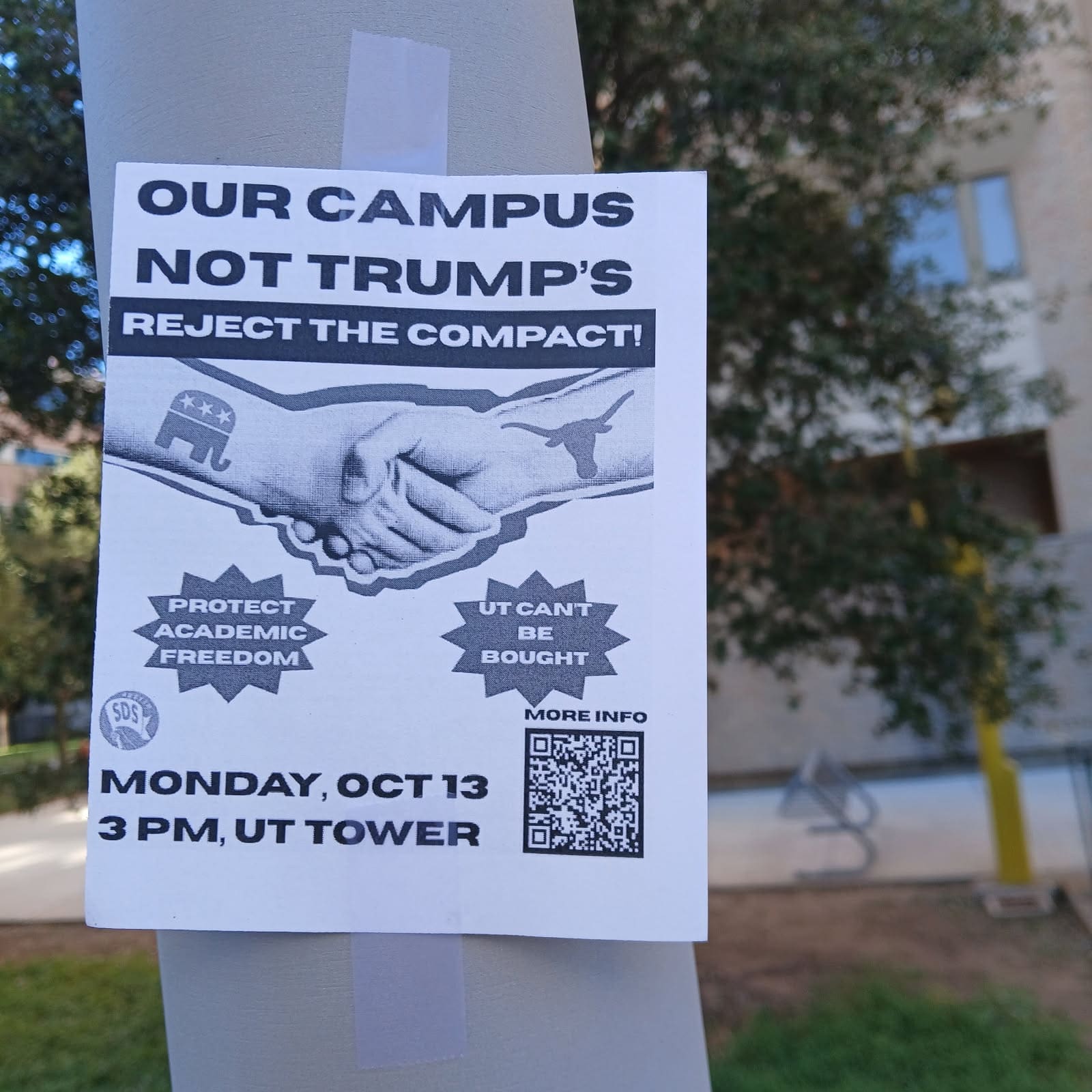 The rally, organized under slogans like “Our Campus Not Trump’s” and “Rally for Academic Freedom,” drew a crowd of around 100 in front of the UT Tower. While decrying President Donald Trump as a “fascist” and comparing conservatives to “Nazis,” protestors called for the university to reject the compact.